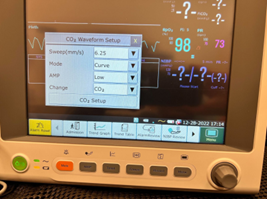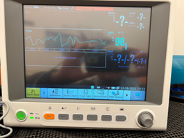 This picture shows a small green light illuminated between the green power button and the wave symbol. This indicates the monitor is getting power. The yellow light indicates that the battery is being charged.